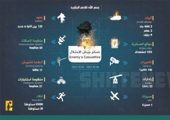 The Islamic Resistance’s military media published an infographic demonstrating the Israeli occupation army’s casualties on the Lebanese border with occupied Palestine after 23 days of resistance operations “on the road to Al-Quds.”