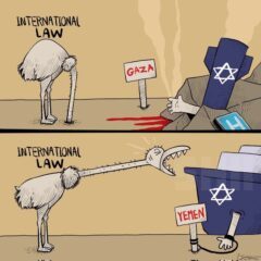 In one of his viral cartoons published last week, he portrayed an Israeli-American hand holding a big knife that cuts open a Palestinian child on a book titled ‘International Law.’