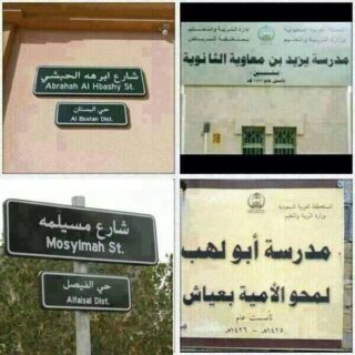 صرف یزید لعنتی ہی نہیں آل سعود کو تمام اسلام دشمنوں سے اتنی ہی محبت ہے جس کی بناء پر انہوں نے اپنے ملک میں رسول خداؐ کے سب سے بڑے دشمن اور قرآن مجید میں لعنت کے حقدار قراردیئے گئے ابولھب کے نام سے منسوب مدارس دینیہ بھی قائم کیئے ہوئے ہیں جبکہ خانہ کعبہ پر ہاتھیوں کا لشکر لیکر حملہ کرنے والے اورخدا کے معجزے سے ابابیلوں کی کنکریوں سے بھسم ہوجانے والے ابرہہ اور رسول خداؐ کے مقابل اپنی جھوٹی نبوت کا اعلان کرکے بیعت لینے والے تاریخ اسلام کے سب سے بڑے جھوٹے مسیلمہ کذاب کے نام سے بھی شاہراہیں منسوب کی ہوئی ہیں۔
