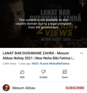 تفصیلات کے مطابق یوٹیوب انتظامیہ نے معروف نوحہ خواں میثم عباس کے مشہور کلام لعنت بردشمن زہراؑ کو پاکستانی یوٹیوب صارفین کے لیئے بینڈ کردیا ہے ۔ یوٹیوب پر اس نوحے کو سرچ کرنے والے صارفین کو یوٹیوب انتظامیہ کی جانب سےانگریزی زبان میں ایک تحریری پیغام موصول ہورہا ہے جس میں لکھا ہوا ہے کہ ’’حکومت کی قانونی شکایت کے سبب یہ مواد اس ملک کے صارفین کیلئے دستیاب نہیں ہے‘‘۔