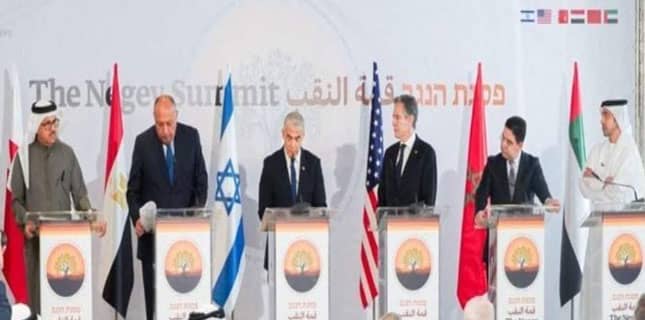 قبل ازیں اسرائیلی وزیر خارجہ یائر لیپید نے مہمانوں کو خوش آمدید کہتے ہوئے کہا کہ وقت آگیا ہے کہ مشرق وسطیٰ میں انتشار پھیلانے والوں کا مل کر مقابلہ کیا جائے جس کے لیے یہ اجلاس طلب کیا گیا ہے۔
