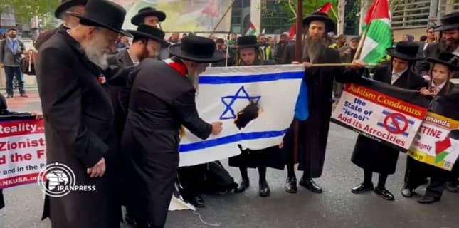 مظاہرین فلسطینی ایرانی اور لبنانی پرچم اٹھائے ہوئے تھے اور وہ فلسطین میں صیہونی حکومت کی وحشیانہ جرائم کی مذمت کر رہے تھے۔