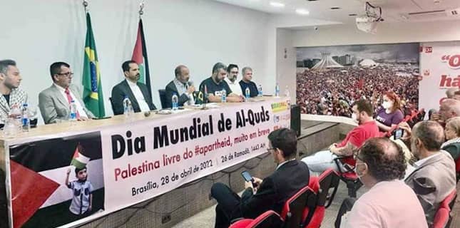 امام خمینی کے فرمان پر ہر سال رمضان المبارک کے آخری جمعے کے روز منائے جانے والے ’’عالمی یوم القدس‘‘ کے حوالے سے منعقد کی جانے والی اس تقریب میں برازیل میں فلسطین انسٹیٹیوٹ کے سربراہ، برازیلیا قومی اسمبلی کے کئی ایک اراکین، سیاسی جماعتوں کے سربراہوں، سول تنظیموں کے مرکزی رہنماؤں اور برازیل کے شہری فلسطینی حامیوں نے شرکت کی۔