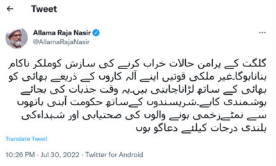 علامہ راجہ ناصرعباس کی گلگت میں عزاداروں پر فائرنگ کی مذمت، مجرموں کو کیفرکردار تک پہنچانے کا مطالبہ