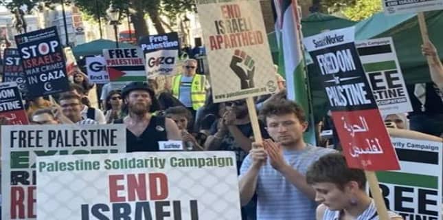 کل کے مظاہرے میں مقررین نے اسرائیل کے جرائم کے جواب میں برطانوی وزیر خارجہ لز ٹرس کے بیان پر تنقید کی۔ تراس، جو وزیراعظم کا عہدہ سنبھالنے کے لیے مجوزہ اختیارات میں سے ایک ہیں، نے اس بیان میں ’’اسرائیل کے اپنے دفاع کے حق‘‘ پر زور دیا۔