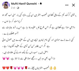 اپنے آفیشل فیس بک اکاؤنٹ پر شعیب اختر کے عشق اہل بیتؑ کی تعریف و توصیف کرتے ہوئے مفتی حنیف قریشی نے لکھاہے کہ یہ قومی کرکٹ ٹیم کےسابق کھلاڑی شعیب اختر ہیں ان کی یہ وڈیو کئی بار سنی اب مجبور ہو کر پوسٹ کر رہا ہوں ۔
