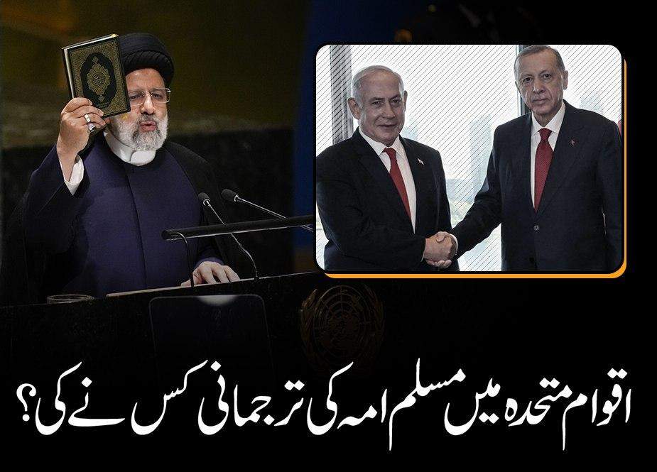 ایک طرف تو مسلم دنیا کے عوام مغربی حکومتوں کے دوہرے معیار پر نالاں اور احتجاج کناں ہیں، لیکن دوسری طرف ہم دیکھتے ہیں کہ مسلم دنیا کو لیڈ کرنے کے خواب دیکھنے والے ترک صدر رجب طیب اردگان فلسطینیوں کے قاتلوں کے بغل گیر ہیں تو کیا یہ دوہرا معیار ہی ہے یا عالم اسلام اور فلسطینیوں کے خون اور قربانیوں سے خیانت ہے؟ اس بات کا فیصلہ قارئین پر ہے کہ وہ اپنی رائے کمنٹ میں دے کر فیصلہ کریں۔ دوسرے مسلم ممالک کے حکمرانوں نے بھی اقوام متحدہ کے اس اجلاس سے خطاب کیا ہے۔ جنہوں نے اپنی حکومتوں کی پالیسی کے مطابق کچھ نہ کچھ بات کی ہے اور چلتے بنے۔ آیئے اب ایک اور مسلم رہنماء اور مسلمان حکومت کے سربراہ کی بات کرتے ہیں۔ ایران کے صدر ابراہیم رئیسی۔ ایران کے صدر نے اقوام متحدہ کے اجلاس میں اپنی تقریر کے آغاز پر ہی مغربی دنیا کے کھوکھلے نعروں اور نظریات کو اپنے ہاتھوں میں قرآن بلند کرتے ہوئے بے رحمی کے ساتھ کچل دیا اور کہا کہ یہ قرآن الہیٰ کتاب ہے، جو انسانوں کے مابین اتحاد اور محبت کا درس دیتی ہے۔