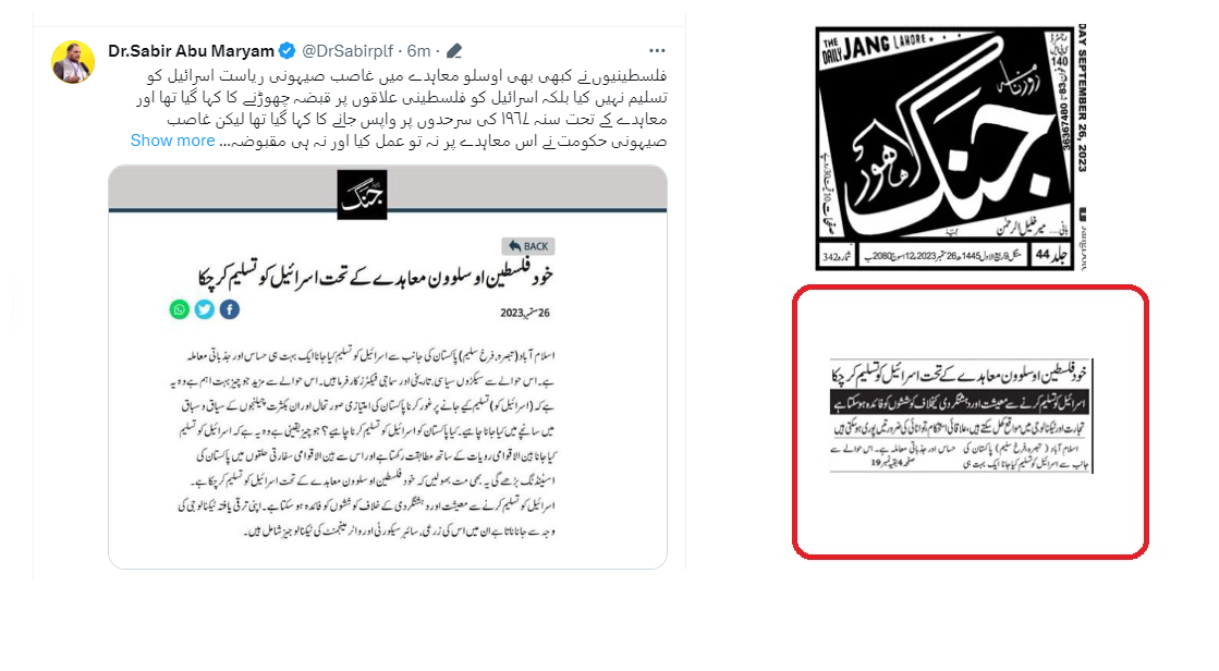 شیعت نیوز: روزنامہ جنگ کی طرف سے مرکزی صفحہ پہ اسرائیل کے حق میں خبر شائع کرنے پہ فلسطین فاونڈیشن کے سیکرٹری جنرل ڈاکٹر صابر ابو مریم نے روزنامہ جنگ سے وضاحت طلب کرلی ۔