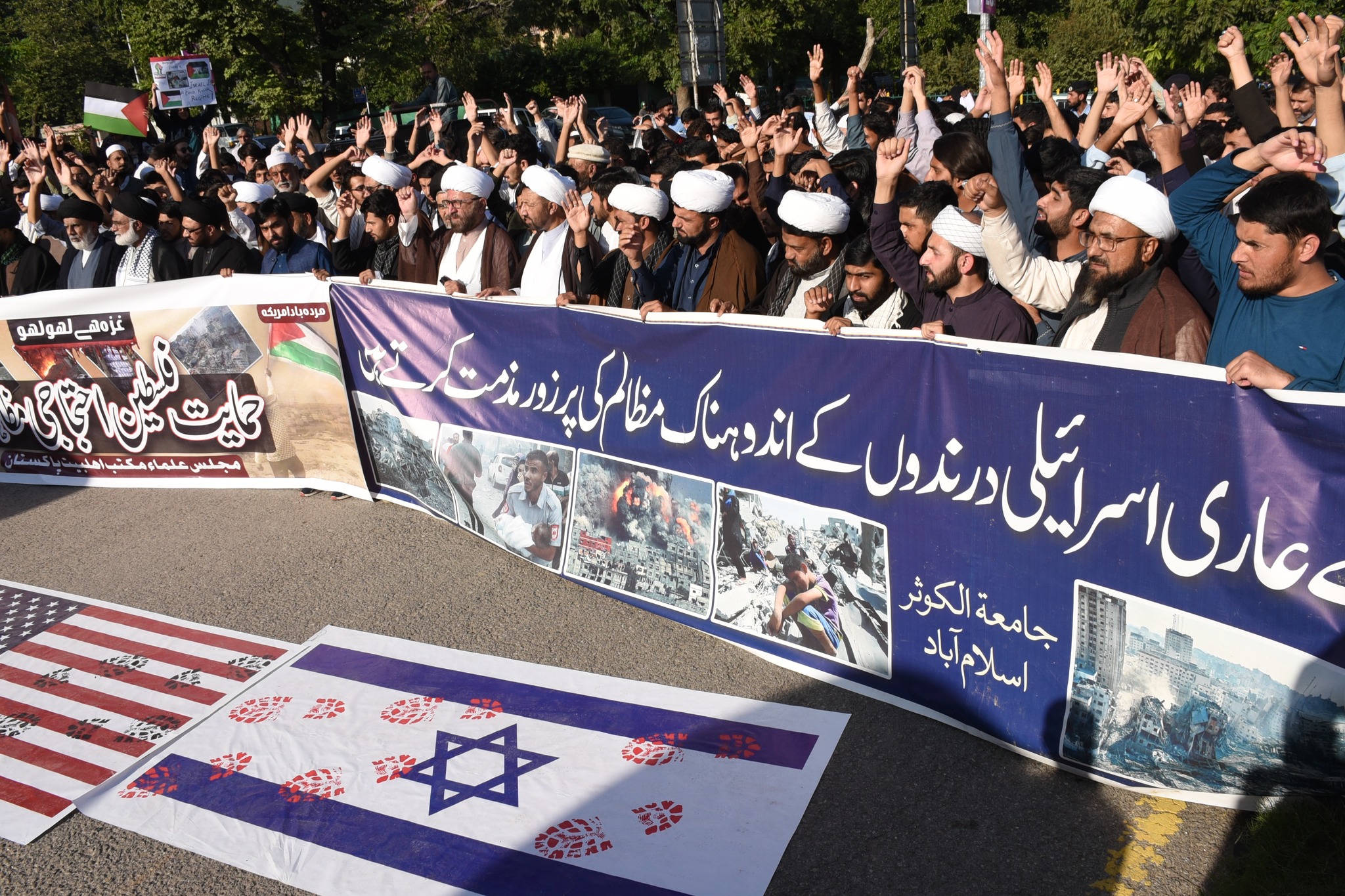 شیعیت نیوز: مجلس علماء مکتب اہلبیت پاکستان و مدارس دینیہ کے زیر اہتمام نیشنل پریس کلب پر حمایت فلسطین احتجاجی مظاہرہ کیا گیا جس میں علمائے کرام و مدارس دینیہ کے طلاب کی بڑی تعداد شریک تھی، جنہوں نے اپنے ہاتھوں میں بینرز اور پلے کارڈز اٹھا رکھے تھے، جن پر اسرائیل مخالف نعرے درج تھے، مظاہرین کا اسرائیل کے خلاف شدید غم وغصہ اظہار کرتے ہوئے شدید نعرہ بازی۔