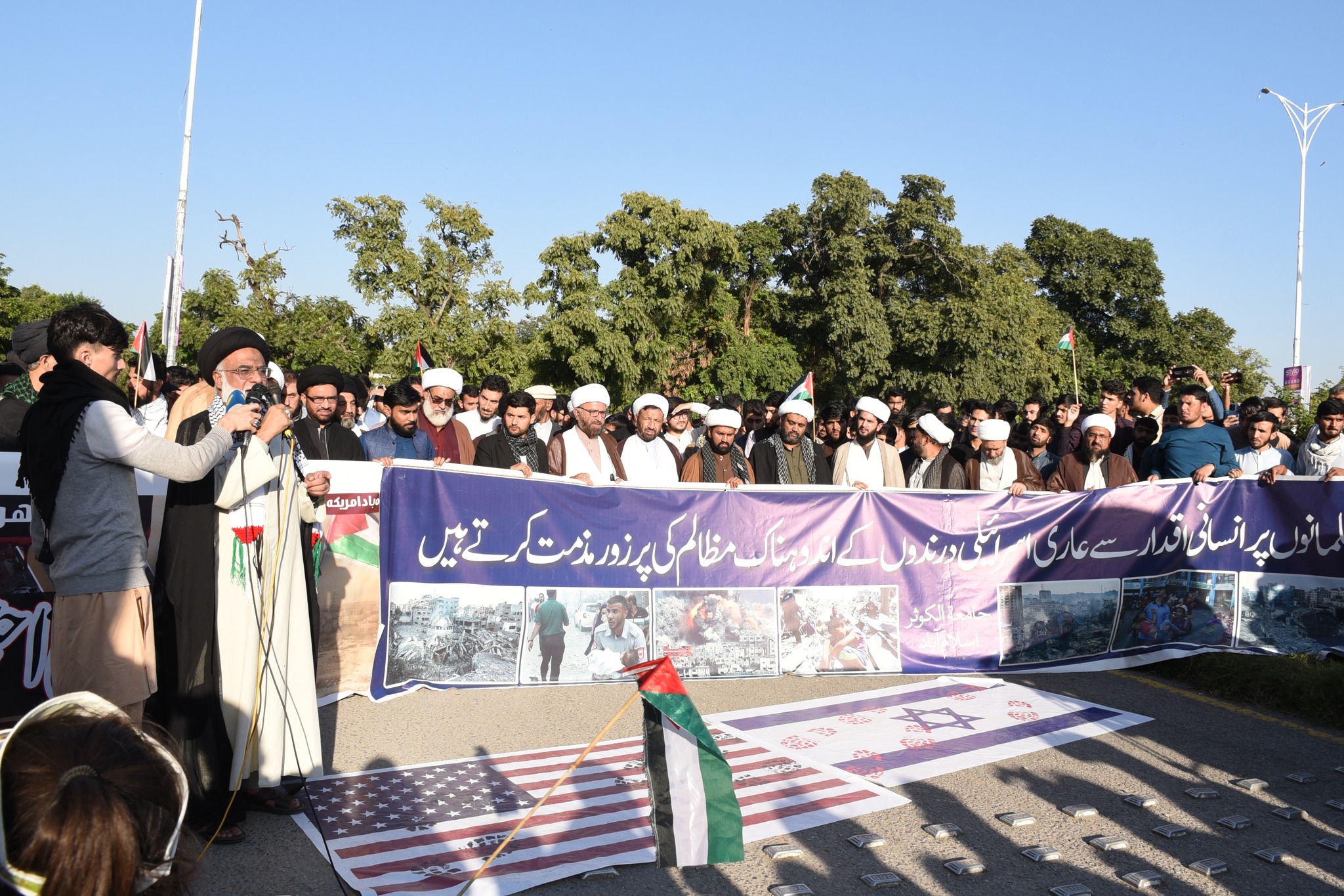 مطاہرین نے اپنے ہاتھوں میں بینرز اور پلے کارڈز اٹھا رکھے تھے، جن پر اسرائیل مخالف نعرے درج تھے،