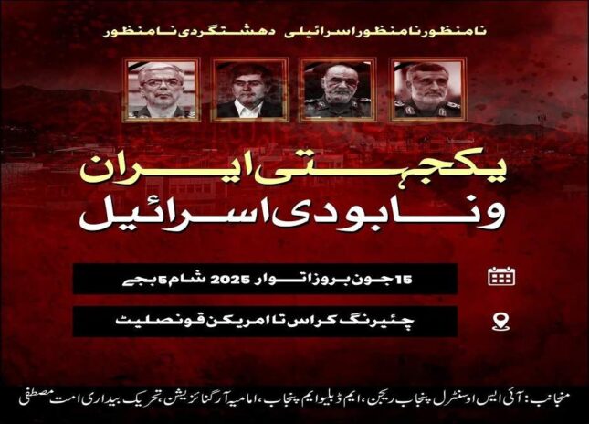 شیعیت نیوز : ایران کیساتھ اظہار یکجہتی اور اسرائیل سے اظہارِ برات کیلئے زندہ دلان لاہور آج سڑکوں پر ہوں گے۔