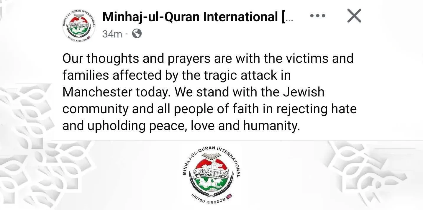 تنظیم نے اپنے پیغام میں یہود ی برادری اور مانچسٹر کے عوام سے یکجہتی کا اظہار کرتے ہوئے کہا کہ اسلام امن، محبت اور بھائی چارے کا دین ہے اور ایسے حملے کسی طور قابل قبول نہیں۔ بیان میں یہ بھی کہا گیا کہ مسلمانوں اور یہودیوں نے نسلوں سے برطانیہ میں باہمی احترام اور مشترکہ اقدار کے ساتھ رہائش اختیار کی ہے اور ان تعلقات کو مزید مضبوط بنایا جانا چاہیے۔