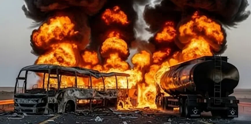 رپورٹس کے مطابق بس تیز رفتار تھی اور سامنے سے آنے والے ڈیزل ٹینکر سے خوفناک ٹکر کے نتیجے میں بری طرح تباہ ہو گئی۔ ٹکر اتنی شدید تھی کہ بس کا اگلا حصہ مکمل طور پر چکناچور ہو گیا اور متعدد مسافر موقع پر ہی شہید ہو گئے جبکہ کئی افراد شدید زخمی ہوئے۔